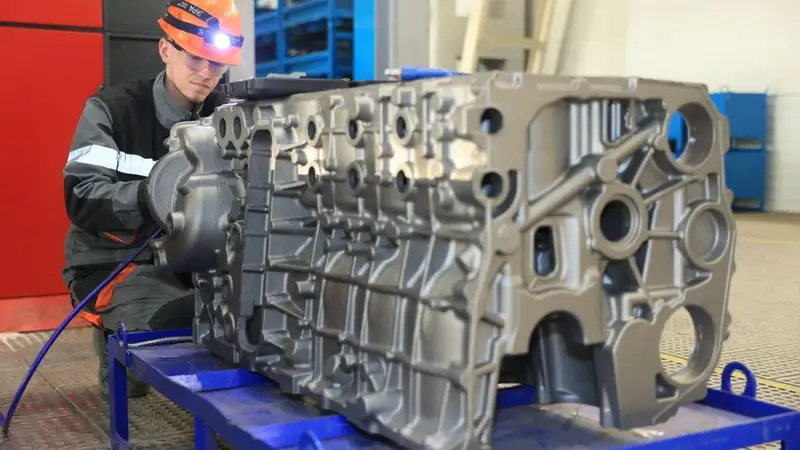 К слову, такой стержневой пакет состоит из 20 отдельных стержней, после сборки он поступает на формовочную линию, куда будет залит металл. И все эти работы ведутся на местном заводе. Здесь уже завершены пуско-наладочные работы по шестицилиндровому рядному блоку цилиндров. Сейчас завод на этапе отладки циклов для выхода на производственную мощь.
