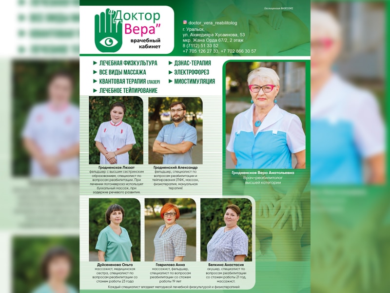 -Мы понимаем, что каждый пациент уникален, поэтому ставим индивидуальный подход в основу нашей работы. Наша миссия - помочь вам достичь и поддерживать оптимальное здоровье и благополучие. Мы предлагаем широкий спектр реабилитационных услуг. Я как врач, высшей категории провожу тщательное обследование и предоставляю реабилитацию индивидуально для каждого больного. Мы предлагаем спектр услуг профилактических программ по реабилитации,чтобы предупредить многие заболевания. В "Доктор Вера" доступны эффективные методы реабилитации, опираясь на последние медицинские достижения. Наша команда готова помочь вам справиться с различными заболеваниями и вернуть вам здоровье и жизненную активность, - говорит Вера Гродненская.